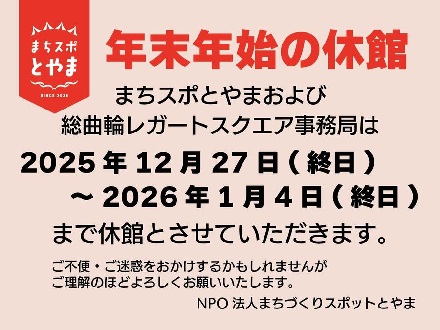 総曲輪レガートスクエアの事務局をしております、まちスポとやまは、2024年12月27日~2024年1月4日まで休館とさせていただきます。